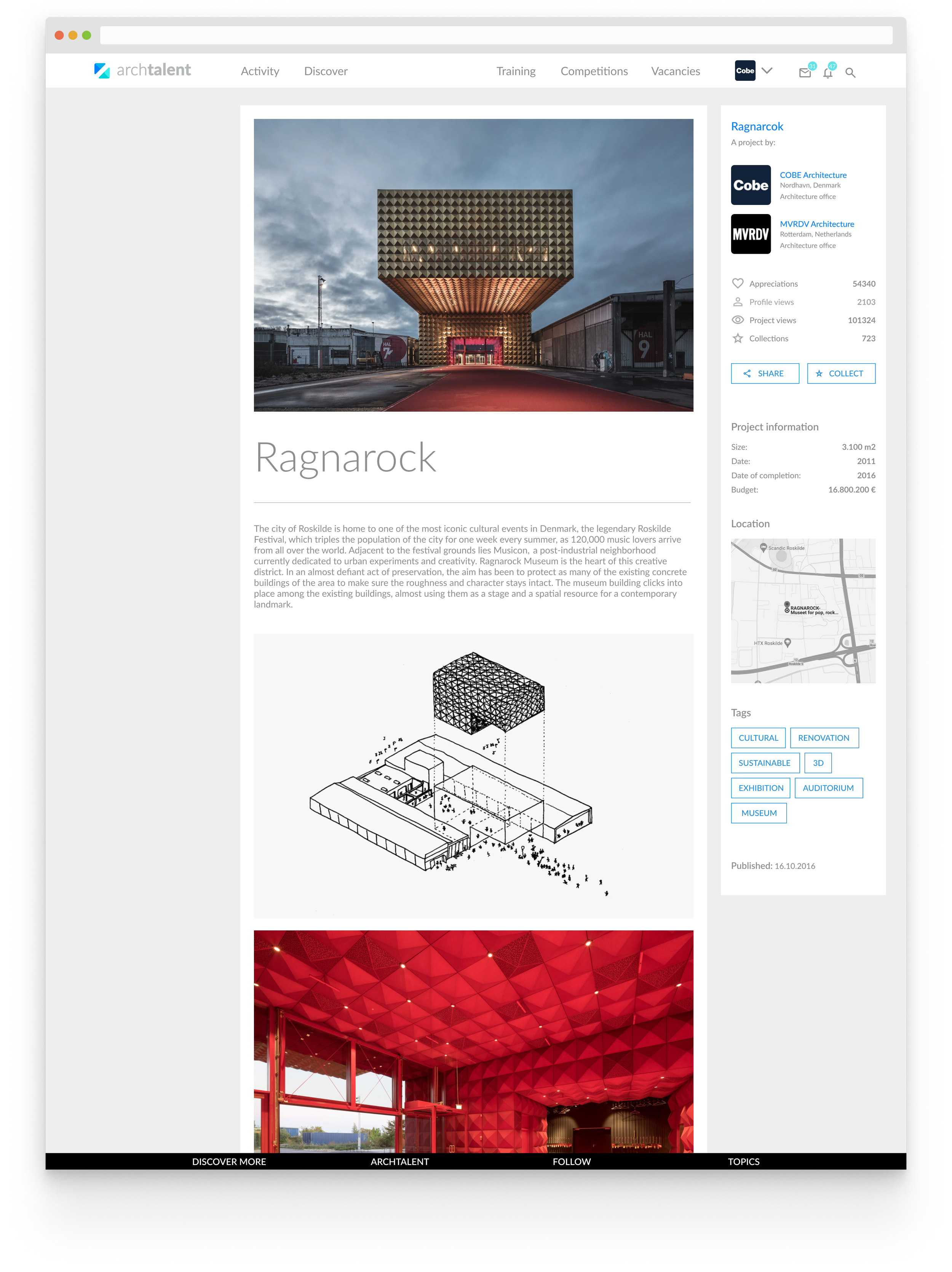 A profile for architecture offices, architects and architecture students. A space for offices to show projects, teams, publish job offers and show stories from the people working in an office. A space for architects and students to show their talent, follow and message other users, get inspired and find job opportunities.